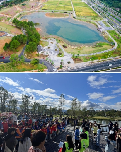 龍州濕地是九龍江流域山水林田湖草沙一體化保護和修復(fù)項目海綿城市建設(shè)范例工程,也是我市2023年十大重點攻堅項目北部新城建設(shè)的“點睛之筆”,主要使用的是國家政策補助資金。項目占地面積約20公頃,通過“護山、理水、營林、興田、清湖、豐草”六大舉措,構(gòu)建了蓄洪湖區(qū)、生態(tài)修復(fù)區(qū)、農(nóng)田區(qū)及休閑區(qū)多樣用地,同時設(shè)置了蓄洪湖、濕地步道、山谷攔蓄、引水工程等海綿設(shè)施,實現(xiàn)“城在田中田在城中”山水田園與城市和諧共生的美好景象。