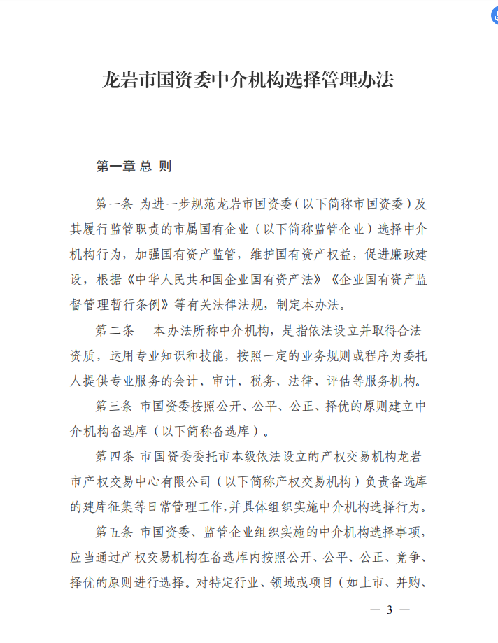 龍巖市國資委關(guān)于印發(fā)中介機(jī)構(gòu)選擇管理辦法的通知(龍國資[2020]45號)