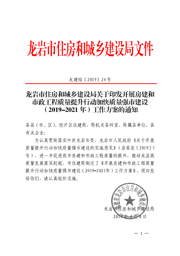 龍巖市住房和城鄉(xiāng)建設(shè)局關(guān)于印發(fā)開展房建和市政工程質(zhì)量提升行動(dòng)加快質(zhì)量強(qiáng)市建設(shè)(2019-2021年)工作方案的通知